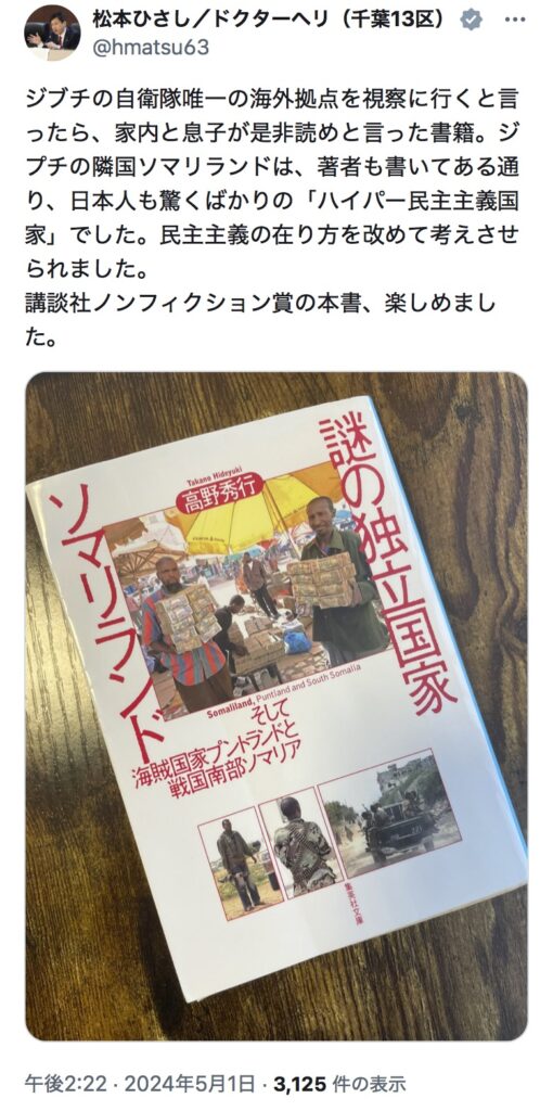 2024年の5月に、松本尚氏がアフリカのジブチにある自衛隊の拠点を視察したときのことです。