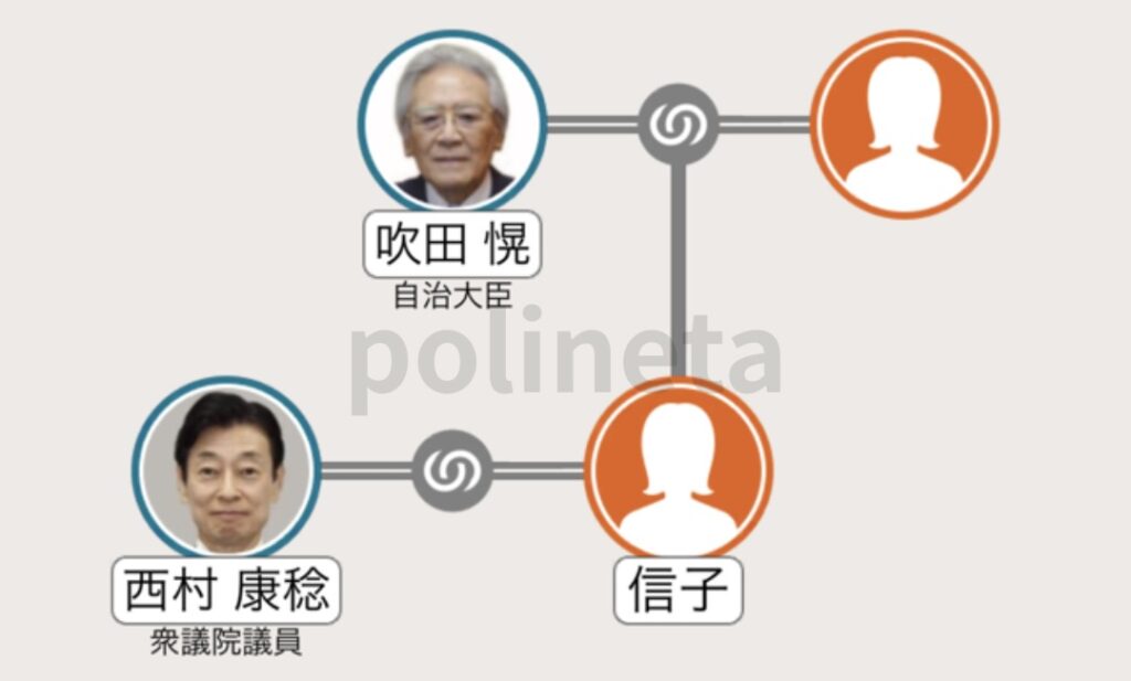 鍵を握るのが、妻・西村信子氏の父である吹田愰氏の存在です。